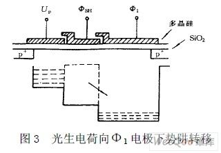 如图3 所示,MOS 电容中的信号电荷包通过转移栅转移到模拟移位寄存器的Φ1 电极下的势阱中。当 ΦSH 由高变低时,ΦSH 低电平形成的浅势阱将存储栅下势阱与Φ1 电极下的势阱隔离开。存储栅势阱进入光 积分状态,而模拟移位寄存器将在Φ1 与Φ2 脉冲的作用下驱使转移到Φ1 电极下势阱中的信号电荷向左转移, 并经输出电路由OS 电极输出。由于结构上的安排,OS 端首先输出13 个虚设单元信号,再输出51 个暗信号, 然后才连续输出S1 到S2160 的有效像素单元信号。第S2160 信号输出后,又输出9 个暗信号,再输出2 个奇 偶检测信号,以后便是空驱动??涨靠梢允侨我獾摹S捎诟闷骷橇搅胁⑿蟹制?、偶传输的,所以在 一个ΦSH 周期内至少要有1118 个Φ1 脉冲,即TSH>1118T1。ΦR 为复位级的复位脉冲,复位一次输出一个 信号。
