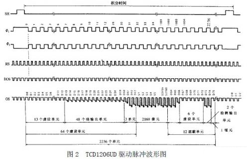 (1)工作原理。 TCD1206UD 在图2 所示的驱动脉冲作用下工作。当ΦSH 脉冲的高电平到来时,正值Φ1 电极下均形成深势阱,同时ΦSH 的高电平使Φ1 电极下的深势阱与MOS 电容存储势阱沟通。