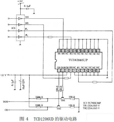在1MHz 数据率情况下工作时,有效像元输出时间为2.16ms,钢丝绳直径信号产生于2.16ms 期间。输出信号的暗电平可控制在1.0V 左右。而高电平可接近10V,相差比较大。当光学系统调整得比较好时,图像边缘的信号比较陡,测量误差较小。TCD1206UD 的工作原理和驱动电路如下: