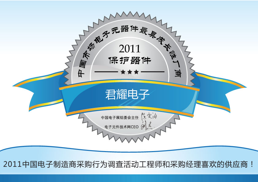 在近日刚刚结束的2011中国电子制造商采购行为调查暨中国市场电子元器件领军厂商的评选活动中,君耀电子凭借本地化和快速的服务、可靠稳定的产品质量和技术指标等多方面优势,以及在工程师心目中形成的良好形象,一举荣获2011中国市场电子元器件保护器件类最具成长性厂商称号!