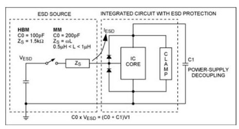 静电放电强度以电压形式表示,该电压由电容的储能电荷产生,最终传递到IC。作用到IC的电压和电流强度与IC和ESD源之间的阻抗有关。对电荷来源进行评估后建立了ESD测试模型。