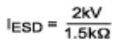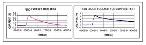 如果对IC引脚进行 HBM测试,测试电路的初始电压是2kV,通过ESD二极管的电流约为1.33A(图2):