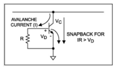 双极型IC的箝位电路类似于在受?;ず说缏分刑峁┮桓鍪艹寤魇被鞔┑牟考?,图3给出了图1中箝位功能的详细电路。箝位晶体管的过压导致集电极-基极之间的雪崩电流,发射结的正向偏置会进一步提高集电极电流,导致一个“突变”过程。箝位时的V-I特性曲线如图4所示。