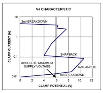 [page]箝位电压从第一次击穿变化到突变稳定后的导通电压,如图5所示。为保证箝位时关闭正常的工作条件,设计的箝位电压一般要略高于IC的绝对最大电压。