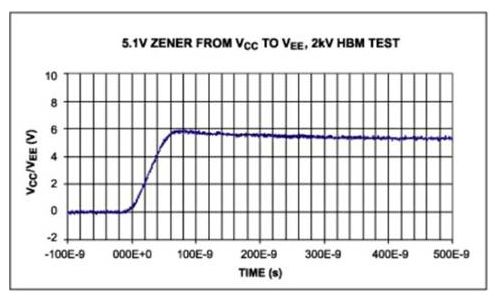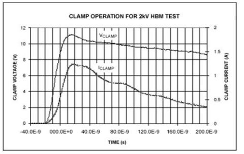 箝位二极管在IC其它电路遭到破坏之前导通,箝位管要有足够的承受力,保证ESD电流不会导致二次击穿。2kV HBM测试的箝位过程如图5所示,图5中的电压包括I-R压降和突变稳定后的箝位电压。