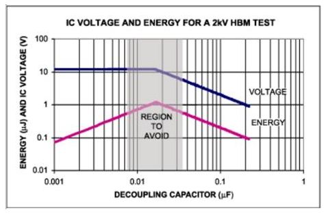 对于高速双极型IC,HBM测试中吸收的最大能量是1μJ;2kV人体模式下,如果电容小于0.02μF(图 6),C1>>C0二极管会产生动作。为了使去耦电容的能量低于1μJ,去耦电容有两种选择:要么容值大于0.05μF,要么小于 0.005μF。当使用更高的测试电压时,要按比例增大0.05μF电容的尺寸。