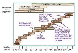 高清电视及显示器的发展加速提高了信号传输速率,除此之外,USB 2.0以及USB 3.0等高速串行协议的应用也使信号速率在不断提高。随着信号速率的提高,以前传统的ESD?;ぜ际跻严缘霉?,多层压敏电阻、硅二极管的高电容、漏电流以及钳位电压已经不能提供准确可靠的?;?,以保证高速信号不发生明显的信号降级。