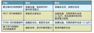 表 1给出了在静电放电抑制器件中常用的几种核心技术的优点和缺点对比。聚合物静电放电抑制器件在各种技术中可提供最低的漏电流,可承受非常高的静电放电电压脉冲,但在多次静电放电事件后器件会开始降级。除此之外,该类器件相对高的触发电压和钳位电压(比空气间隙放电产品高出50~100倍)则意味着更多的静电放电脉冲能量可以通过被?;さ牡缏?。