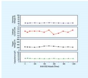 通过采用间隙技术(gap technology),特别是采用空气作为间隙,已经在低电容抑制器、更低漏电流、更低钳位电压等方面实现了可观的性能提升。总之,在重复多次或持续的 ESD事件后,聚合物间隙抑制器会降级,而空气间隙器件仍将保持非常低的电容、漏电流和触发电压,即使在1s事件间隔内经过1000次ESD事件,也能保持良好的性能。