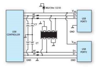 许多高速数据应用和终端产品采用混合式保护方式,在数据和时钟线上采用基于间隙的器件,在电源连接部分采用多层压敏电阻或基于硅的瞬态电压抑制二极管。例如,USB接口的D+和D–线要求高速保护,这可以采用分立的芯片利用附加的多层压敏电阻或瞬态电压抑制器件用于VDD电源?;ぁC、笔记本电脑、上网本等产品中常常需要多个USB接口连接。