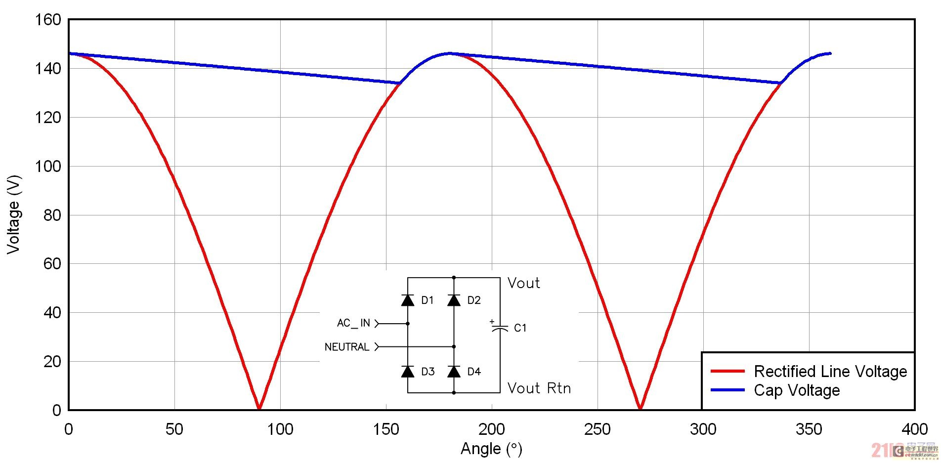 图 1 和图 2 显示了离线电源中使用的两种整流器配置结构。图 1 为一个全波桥接,其中,AC 输入电压经过简单整流以后便被送至电容。这种电路常见于宽范围 AC 和 230 伏 AC 应用中。电容充电至正弦波峰值,然后在大部分半周期放电。电容纹波电流包括两个部分:首先是充电周期,其电流由电容值和所应用的 dV/dt 决定;其次是电容放电。电源起到恒定电源负载的作用,因此电容以非线性速率实施放电,其计算方法为:W = ½ * C *V^2 = P * dt。