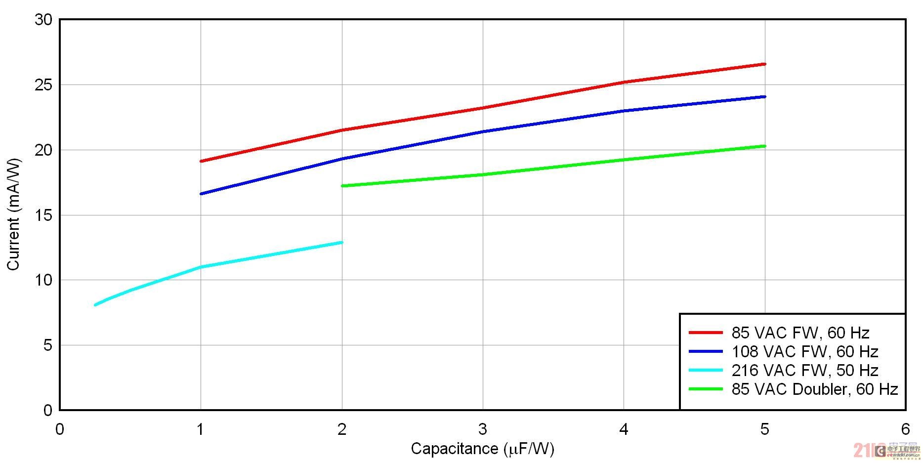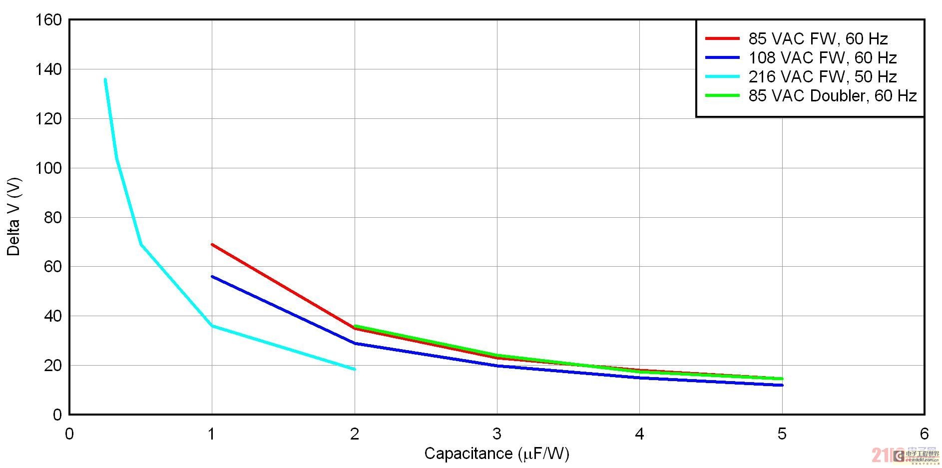 [page]图 3 显示了四种整流器/输入电压方法的 uF/W 标准化压降。共有三种全波桥接方法,适用于低线压美国(108 VAC/60 Hz)、低线压日本(85 VAC/50 Hz)和低线压欧洲(216 VAC/50 Hz)。另外,还有一个低线压日本的倍压器。就全波桥而言,标准化过程只需将电容除以功率。在倍压器中,标准化方法是将两个串联电容之一的电容除以功率。要想使用该曲线图,请首先确定您的整流器配置结构,并选择一个可以接受的压降。之后,您只需读取输入电容的 uF/W 便可。最后,通过乘以您的功率,便可去标准化。