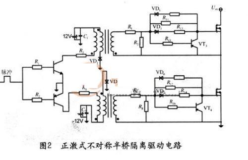 文献提出一种正激式不对称半桥隔离驱动电路,如图2所示。
