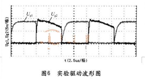 本文设计了一台不对称半桥变换器样机:工作频率为98kHz,输人电压为400VDC,输出电压为30VDC。测得占空比为0.47时的驱动波形Ug1,Ug1如图(6)所示。
