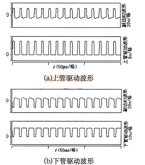 在SABER仿真下,该变压器副边N2,N3以及上、下管的驱动波形分别如图5(a)、(b)所示。