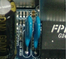 主板上小尺寸的贴片电容,我们无从判断品牌,容值等参数,所以我们主要是去观察那些大的插脚电容,主要分布在主电源模块和CPU电源???,这个不难判断,自己去找高楼林立的电容群吧。用料上来看,固态电解电容为上佳,如下图蓝色标记的电容,基本外观是铝壳包装。但目前市场上,某些黑心厂商,为了使自己的产品能够混淆视听,也给普通的液态电解电容套上了铝壳外衣,达到以次充好的目的。如下图,黑色标记的铝壳电容为看上去很像固态电解电容的液态电解电容,这个在一些廉价主板上应用的较多。