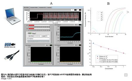 利用该系统同时运行包含预加载PCR反应物的三个聚合物,从抽样到结果所花费时间不到一小时,并且允许采用大量生物的多样性。利用热敏电阻的实时温度反馈,一个内部比例积分微分(PID)芯片来处理温度控制。该控制器由一个补偿器,输出装置和传感器反馈信号组成,反馈信号对于控制加热器输出功率,以及保持温度是很必要的。使用LabVIEW软件,我们对图形用户接口进行编程,以显示实时温度,设置温度,并且显示来自三个通道的实时PCR结果 (如图1A所示)。