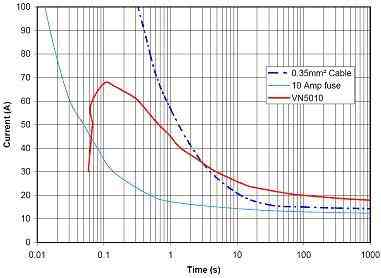 在图3的示例中有一个点,智能开关 (VN5010)将继续前行,而电线将开始自毁(红线在蓝色虚线上方)。如果这种情况是真实的,甚至连电路板都可能会自毁。现在考虑到涌流要求很可能更加严格,我们开始意识到有必要开发一个能够仿真熔断器特性的?;に惴?。