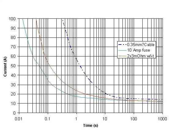 图8:采用?;に惴ǖ耐馔苅2-t曲线与电线和熔断器比较