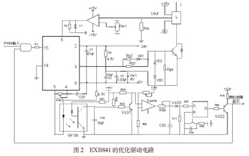 Vs02的集电极输出同时接微处理器,可及时显示故障信息,实现故障报警。EXB841的软关断时间是由内部元件R7和C4的时间常数决定的,为了提高软开关的可靠性,在EXB841的4和5两端外加可调电阻Rw2,可调节软关断时间,在4和9脚两端外加电容 C01,可避免过高的di/dt产生的电压尖峰,但应合理选择二者的值,太大的值将增大内部三极管V3的集电极电流。