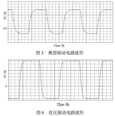图3为实测典型驱动电路驱动波形,图4为实测优化驱动电路波形。通过两图的对比,不难看出,典型驱动电路的反向关断电压不到-5V,正向驱动电压小于14.5V。而优化驱动电路的反偏压则基本达到或接近于-8V,正向驱动电压更是超过了+15V,正反向驱动电压值得到调整的同时,前后沿陡度也得到极大改善。