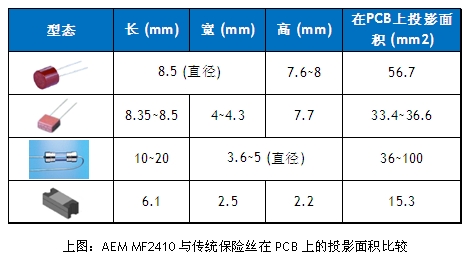 AEM科技研发生产的MF2410通用??槭教O账刻寤挥?.1×2.5x2.1mm,与传统保险丝相比,在PCB上的占用面积可以减少50-80%。