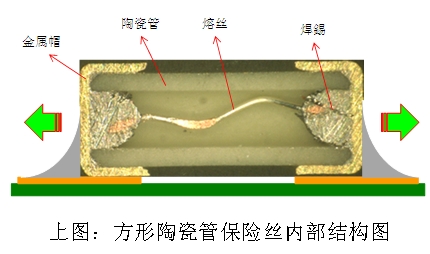 在市场上常见的2410尺寸125Vac或250Vac额定电压贴片保险丝, 多是应用传统方形陶瓷管技术。这一类型贴片保险丝的两端是采用金属帽直接套在方型陶瓷管上, 再以焊锡将金属帽与内部熔丝焊接在一起。一旦产品在高温的SMT产线上作业,连结两端金属帽与内部熔丝的焊锡极有可能会因高温而再次发生熔融情形, 进而导致金属帽脱落的风险。