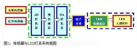 传感器作为信号采集和机电转换的器件,其机电技术都已相当成熟,近几年MEMS技术兴起又将传感器技术向小型化、智能化、多功能化、低成本化大踏步迈进。光敏传感器、红外传感器等各种类型的传感器都可与LED照明灯具组成一个智能控制系统,传感器将采集来的各种物理量信号转换成电信号,可以经由集成电路化的AD转换器、MCU、DA转换器对所采集的信号进行智能化处理,从而控制LED照明灯具开启和关闭。人类可以籍此在MCU上设定各种控制要求,控制LED灯的开关时间、亮度、显色、多彩变幻,从而达到省电节能的目标。传感器与LED灯具组成的系统框图如图1所示。目前的集成电路制造技术已经可以将AD、DA、MCU集成在一个5X5mm或更小的封装内,安装在灯具内既不占面积而且十分方便。