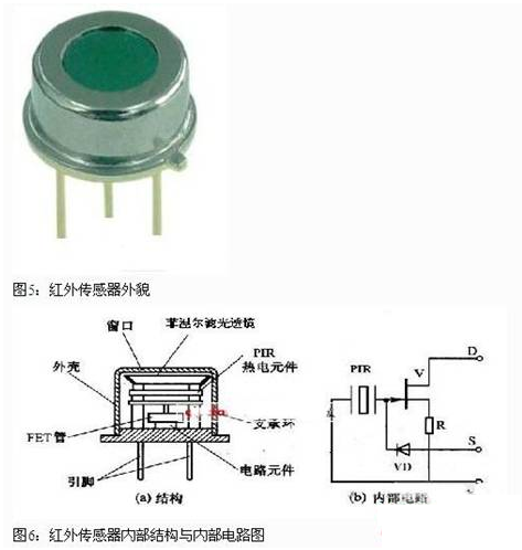 被动式红外传感器有三个关键性的元件:菲涅尔滤光透镜,热释电红外传感器(PIR)和匹配低噪放大器。菲涅尔透镜有两个作用:一是聚焦作用,即将热释红外信号折射在PIR上:二是将探测区内分为若干个明区和暗区,使进入探测区的移动物体(人)能以温度变化的形式在PIR上产生变化的热释红外信号。一般还会匹配低噪放大器,当探测器上的环境温度上升,尤其是接近人体正常体温(37℃)时,传感器的灵敏度下降,经由它对增益进行补偿,增加其灵敏度。输出信号可用来驱动电子开关,实现LED照明电路的开关控制。图5是红外传感器外貌,图6 是红外传感器内部结构与内部电路图。图7 是带红外传感器的LED照明灯具,这是一款E27标准螺口灯头的灯具,它的电源适用范围是 AC180V-250V (50/60Hz), 红外传感器检测范围大约在3M—15M,它的标准产品 IFS-Bulb 3W灯具达80 lm ,5W灯具达140 lm 。在LED光源??榈闹醒氩糠智度牒焱庀叽衅鳌R坏┖焱獯衅骷觳獾饺说奶逦?,LED电灯泡将会在50秒内自动开启与关闭。适用于任何一种室内应用,如走廊、储藏室、楼梯和大厅入口处。