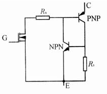2)超出关断安全工作区引起擎住效应而损坏擎住效应分静态擎住效应和动态擎住效应。IGBT为PNPN4层结构,其等效电路如图1所示。体内存在一个寄生晶闸管,在NPN晶体管的基极与发射极之间并有一个体区扩展电阻Rs,P型体内的横向空穴电流在Rs上会产生一定的电压降,对NPN基极来说,相当于一个正向偏置电压。在规定的集电极电流范围内,这个正偏置电压不大,对NPN晶体管不起任何作用。当集电极电流增大到一定程度时,该正向电压足以使NPN晶体管开通,进而使NPN和PNP晶体管处于饱和状态。于是,寄生晶闸管导通,门极失去控制作用,形成自锁现象,这就是所谓的静态擎住效应。IGBT发生擎住效应后,集电极电流增大,产生过高功耗,导致器件失效。动态擎住效应主要是在器件高速关断时电流下降太快,dvCE/dt很大,引起较大位移电流,流过Rs,产生足以使NPN晶体管开通的正向偏置电压,造成寄生晶闸管自锁[2]。