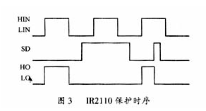 本设计逆变器为半桥式结构,串联谐振负载,驱动采用IR公司的IR2110半桥驱动芯片。IR2110电路简单,成本低,适用于中大功率IGBT,实验结果也验证了IR2110驱动中大功率IGBT的可行性。IR2110芯片有一个封锁两路驱动的SD输入端,当此引脚为高电平时,立刻封锁两路输出,如图3所示。