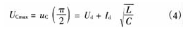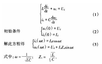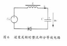 假设逆变关断时滤波电感中的电流全部从电容C中流过,同时整流器继续输出电压Ud。图6给出了等效电路,L与C串联谐振,由于整流桥电流只能单向流通,所以振荡到T/4时结束。