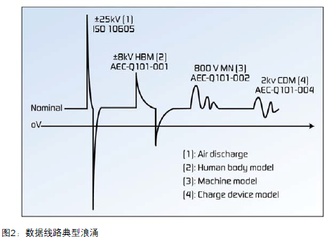 图2显示数据线路上产生的瞬态主要是ESD浪涌。尽管此类浪涌为低能量,但是会产生强大的电磁场。
