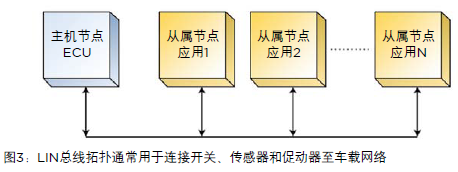 LIN总线拓扑利用一台独立主机或ECU(电子控制单元)以及多个节点,如图3所示。连接应用??橹脸翟赝缡蛊淇山姓锒虾吞峁┓?。