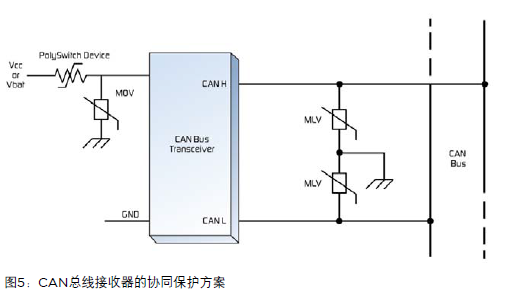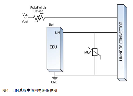 图4为协同的电路?;ね迹允境鲆桓錾柚迷诠β适淙氲目筛次籔olySwitch器件如何在电源输入端?;CU和LIN节点连接器免受过电流情况的损伤,以及一个MLV(多层电压敏电阻器)如何为车载网络应用提供所需的高电流处理和能量吸收的过电压保护。