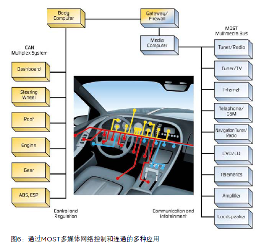实际上,MOST是一个节点网络,用于传输车载多媒体和信息娱乐系统中出现的各种不同信号和数据流。MOST标准支持多种物理接口,如图6所示。MOST标准中,这些应用可参考功能块。每个功能块包括几种功能(如一个CD播放器可以包括播放、停止、弹出和播放时间等功能)。