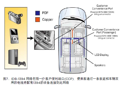 IDB-1394车载结构可分为内置网络和客户便利端口,简称CCP,如图7所示。该标准显示了一种类似于现有MOST标准的一种内置塑料光纤(POF)车载网络。然后,该网络更加稳固且更易使用。多种电子元件可以连接到此网络,如DVD播放器、视屏显示器、导航系统、无线电主机以及通讯设备。
