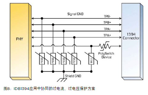 CCP端口包括一个车载等级1394b的物理层和连接器,允许用户将便携式设备连接到车辆,通过IDB-1394接口获取音频和视频服务。CCP端口采用标准连接器,专为该设备供电而设计。其供电特点无需额外电池或单独电源线,让客户无需为插入的设备是否已经通电而担忧。IDB-1394为高速多媒体应用而设计,总线速度高达800Mbps且要求通电端口具有可复位过电流?;?。如图8所示,PolySwitch设备可用于在出现故障时限制危险高电流。MLV可安装到供电总线上避免ESD浪涌和过电压瞬态所产生的损害。低电容PESD设备或PESD阵列也可安装在数据线路上帮助提供ESD?;?。