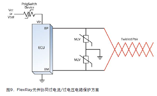 FlexRay协议专为线控应用所设计,如线控刹车和线控方向盘。该线控网络方式支持同步和异步数据传输,数据传输率约为10Mb/s,具有时间触发和事件触发行为、冗位和容错的特点。该结构支持一“束”2个节点至64个节点,其功能主要依靠于两种类型的处理器—ECU和“活动星”。FlexRay通讯通过一个常用总线或一个星形连接在ECU之间进行。FlexRay元件的总线输入必须避免在总线路和系统供电电压或地电位之间出现短路现象。图9显示了ECU的调整后过电流/过电压保护方案。该方案利用一个PolySwitch设备进行过电流?;?,以及两个传统表面安装结构的MLV进行ESD和瞬间过电压保护。