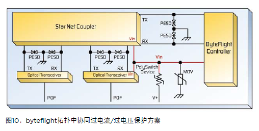 byteflight协议是一个车载数据总线,为提供车载元件之间进行非常安全且容错的电子通讯手段而开发。byteflight在总线、星形或集群配置中通过2线或3线塑料光纤(POF)达到10Mbps以上的速度。该系统结构中使用POF使其功能能够在数据方面达到电气上的独立。然而,节点仍然从车载供电总线处获得电流,而且会受到电磁干扰的影响。构成该网络的元件,如微处理器、byteflight控制器和光收发器,容易因供电尖峰和反向电压而受到损伤。集成电路(ICs)或许包括ESD?;?,但是通常限制在2kV以下。如图10所示,PolySwitch设备和MLV可以保护这些??椴皇芨吣芰抗缪购凸缌魉蔡挠跋於鹕?。