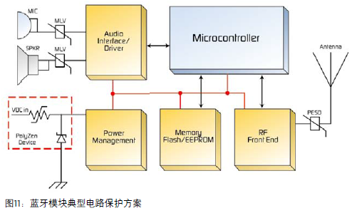 蓝牙标准虽然最初并非为车载环境而设计,但已经为车辆和其系统之间进行沟通的移动电子设备创造了新的市场前景,如手机、MP3播放器和导航设备。?;け┞对谕獾耐ㄑ督缑娌皇芤蛱煜吆鸵瞧魑尴?RF)界面所产生的ESD和其他电压浪涌的影响是一个相当重要的设计问题。图2显示了一个PolyZen集成过电流/过电压设备如何帮助保护蓝牙??榈墓β适淙?。MOV或表面安装的MLV也可用于避免车载麦克风和扩音器界面上出现电压瞬态。PESD设备可以用于避免电线出现ESD浪涌。