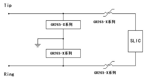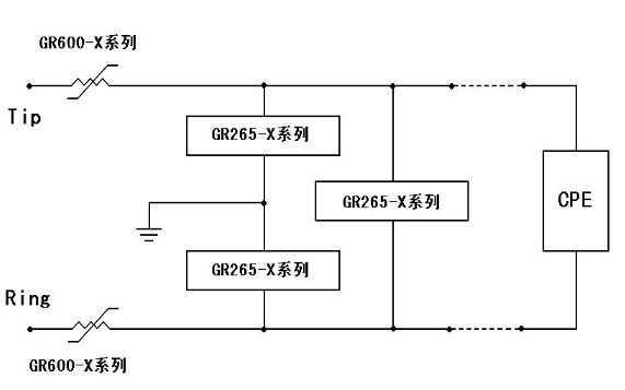 目前本公生产的GR265-X和GR600-X 等系列高分子PTC 热敏电阻和半导体固体放电管一起用于总配线架的保安单元中,可以满足过流和过压?;さ囊螅卑镏0驳ピ阒泄ㄐ判幸当曜?YD/T 694-1999-2002、北美 TelcordiaGR-974 及 ITU-T K.20 等标准,典型的使用电路如上图所示。