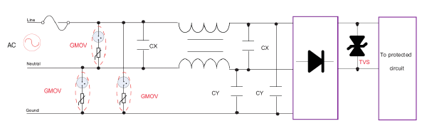 2、110 AC 交流电源雷击浪涌?;びρ∮醚姑舻缪刮?00V~300V 的压敏电阻较合适