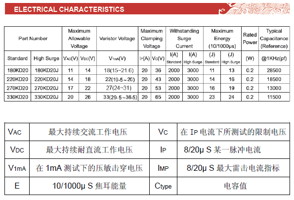 • 电压规格从18V~1800V,突波耐电流能力从几百安培到几十千安培不等,单体最大可达70KA