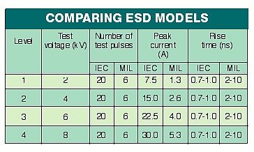 但是,明显的瞬间电压威胁和能量等级的不同存在于两个模型之中。于是设计工程师可以使测试过程适合他们所期望的具体应用。例如,IEC1000-4-2具有一个非??焖俚牡缙铰龀迳仙奔?,能应用更多的脉冲和更高的峰值电流(见表格)。