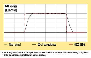 另外,许多新型消费电子器件能执行快速的IEEE-1394/1394b(Fireware)数据转换协议。这种非常高的数据速率(1600 Mbps,1394b)要求低电容ESD抑制器,例如聚合物浪涌器件(图 2c)。测试数据表明,聚合物ESD抑制器带来的信号失真比硅二极管器件?;irewire端口产生的更少(图 3)。
