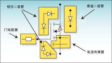 突出显示的元件组成一个特性板,可以将其中的功能集成到MOSFET中。这些元件从右上角开始按顺时针方向为:温度感应二极管、电流传感器、钳位二极管(内部二极管,未显示)和门电阻器。通过加入钳位二极管和门电阻器众所周知的?;ぬ匦裕梢员;ざ缘缪姑舾械恼ぱ趸忝馐芪O盏绯〉钠苹怠?nbsp;