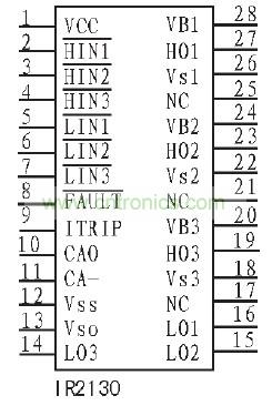 2)由于IR2130的电流检测输入端直接与主电路连接,很容易引入干扰而使系统停机或出现异常,因此,电流检测电阻应采用无感电阻。