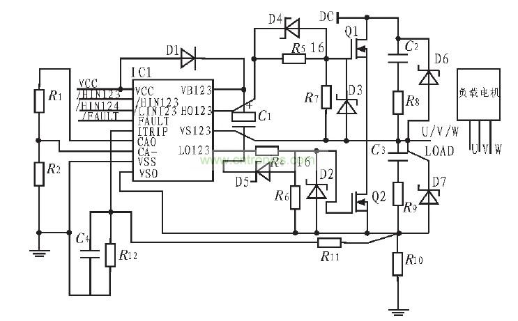 图3是由IR2130组成的无刷直流电机驱动原理图为便于表示只画出其中一个桥臂的电路示意图,通过IR2130输入信号控制MOSFET的开关,由此驱动无刷直流动机。C1是自举电容,为上桥臂功率管驱动的悬浮电源存储能量,D1的作用是防止上桥臂导通时母线电压倒流到IR2130的电源上而使器件损坏,因此D1应有足够的反向耐压,当然D1与C1串联也是为了满足主电路功率开关频率的要求,D1应选快速恢复二极管。 R1、R2、R10、R11、R12、C4组成过流检测电路。R5、R6为栅极驱动电阻,D4、D5为功率管提供了一个低阻抗的放电回路,使功率管能够快速的泄放电荷。
