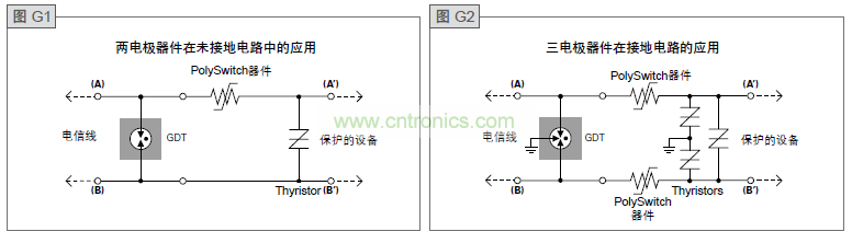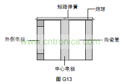 失效保护机构是安装在位于气体放电管中心电极焊块上的短路簧片。如图G12所示,在正常的工作条件下,焊块使得弹簧片浮在外侧电极之上。当长时间放电使气体放电管温度达到焊块的熔点时,焊块就会被软化,促使短路弹片被激活,并与两个外侧电极搭接。这个过程导致三个电极之间永久短路,建立起一条低阻抗路径,将故障电流引到地面,而不会产生显著的热量。